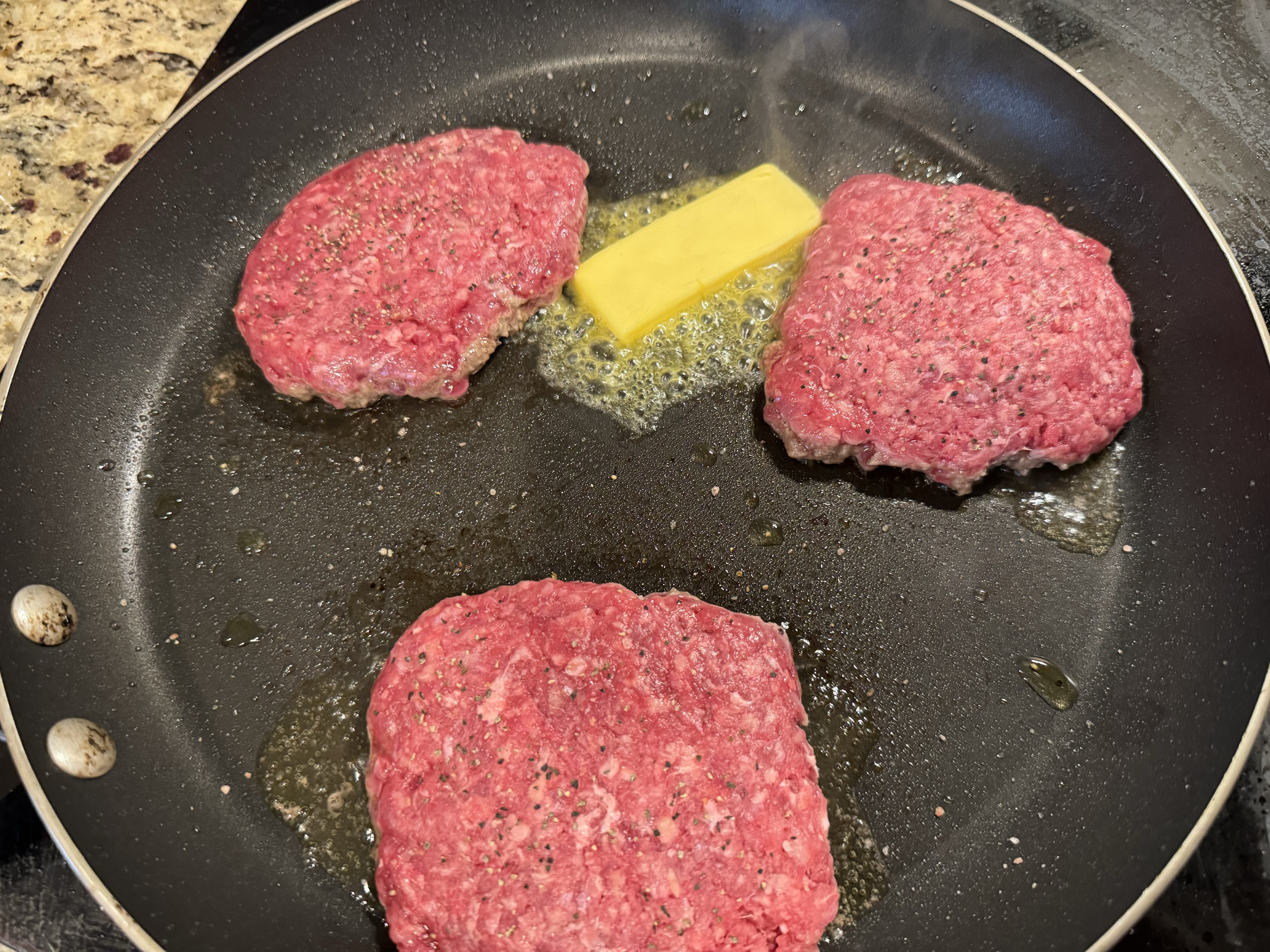 뒤집어서 다시 소금, 후추로 간을 해주고 패티가 줄어들어 공간이 생겨 두 개를 더 넣고 굽고 역시 뒤집어서 또 소금, 후추 간을 해준 후 또 자리가 남아서 나머지 패티 하나를 더 넣었다. 마지막 껀 제일 세게 눌러줬더니 제일 얇으면서 제일 크게 퍼졌다.