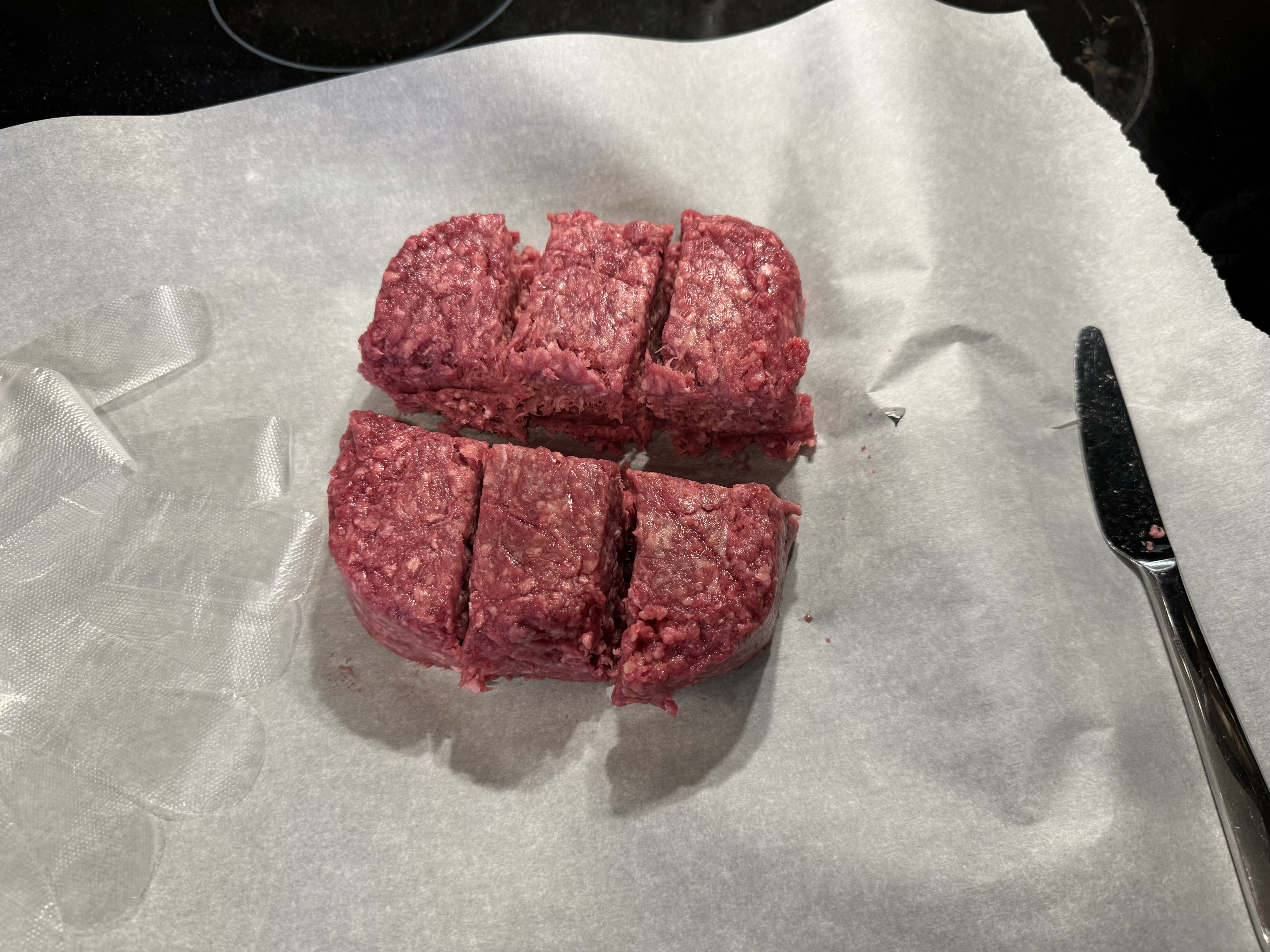 6등분으로 잘라서 살살 햄버거 패티 모양으로 누르면서 모양을 동그랗게 빚어줬다. 이 때 핵심은 너무 주물거리지 않아야 한다.