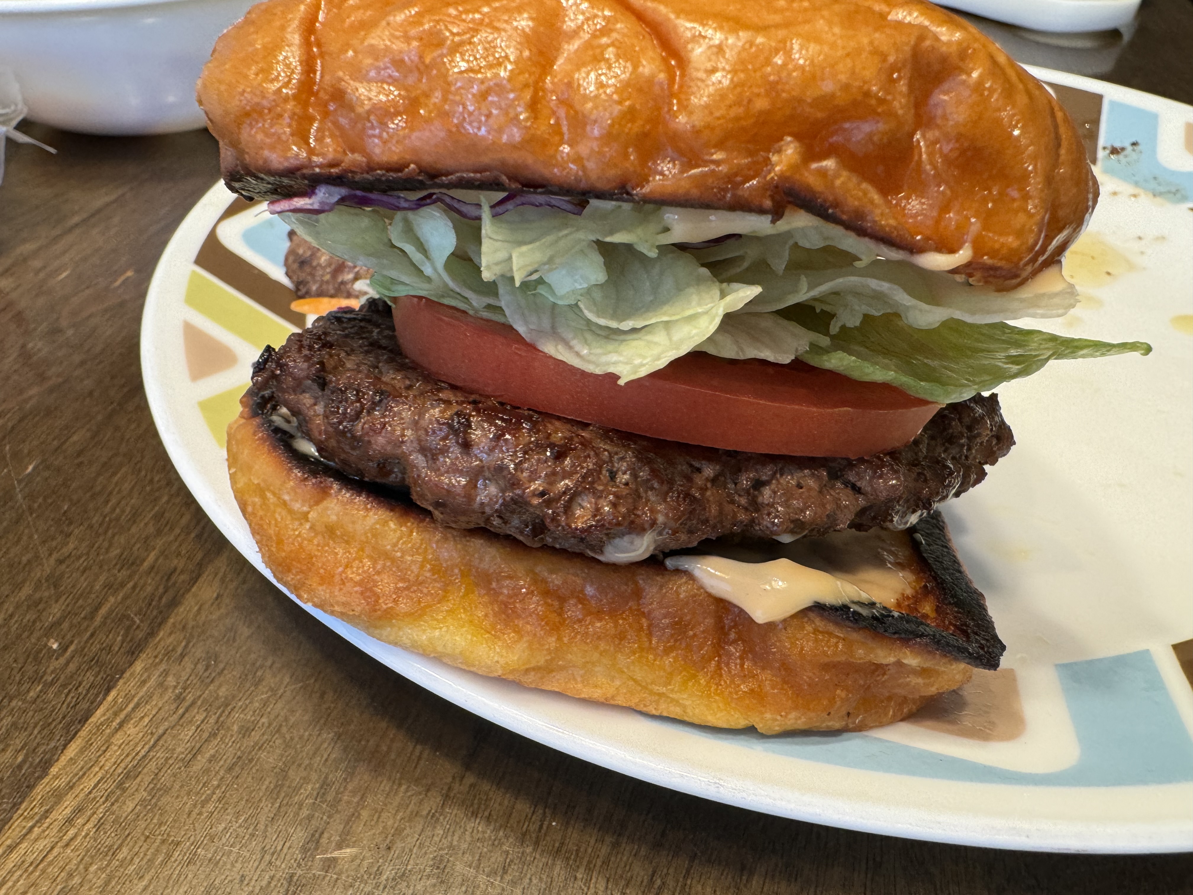 빵은 따로 다른 프라이팬에 버터를 넣고 구워줬는데 사진은 못찍었다. 그렇게 구운 빵 양면에 아까 만든 소스를 바르고 상추, 토마토 넣어서 완성했다. 남편과 아들이 너무 맛있다면서 각각 두 개씩 먹고 내 패티 2/3 개로 빵 하나 더 해서 남편은 총 3개를 먹었다. 아들은 여태까지 먹은 햄버거 중에 최고로 맛있었다고 하면서 내일 또 먹고 싶다고 했다. 그리고 좀 덜 눌러서 뚱뚱하게 만들어진 패티는 그거대로 육즙이 많이 나와서 너무 맛있었다고 했다.