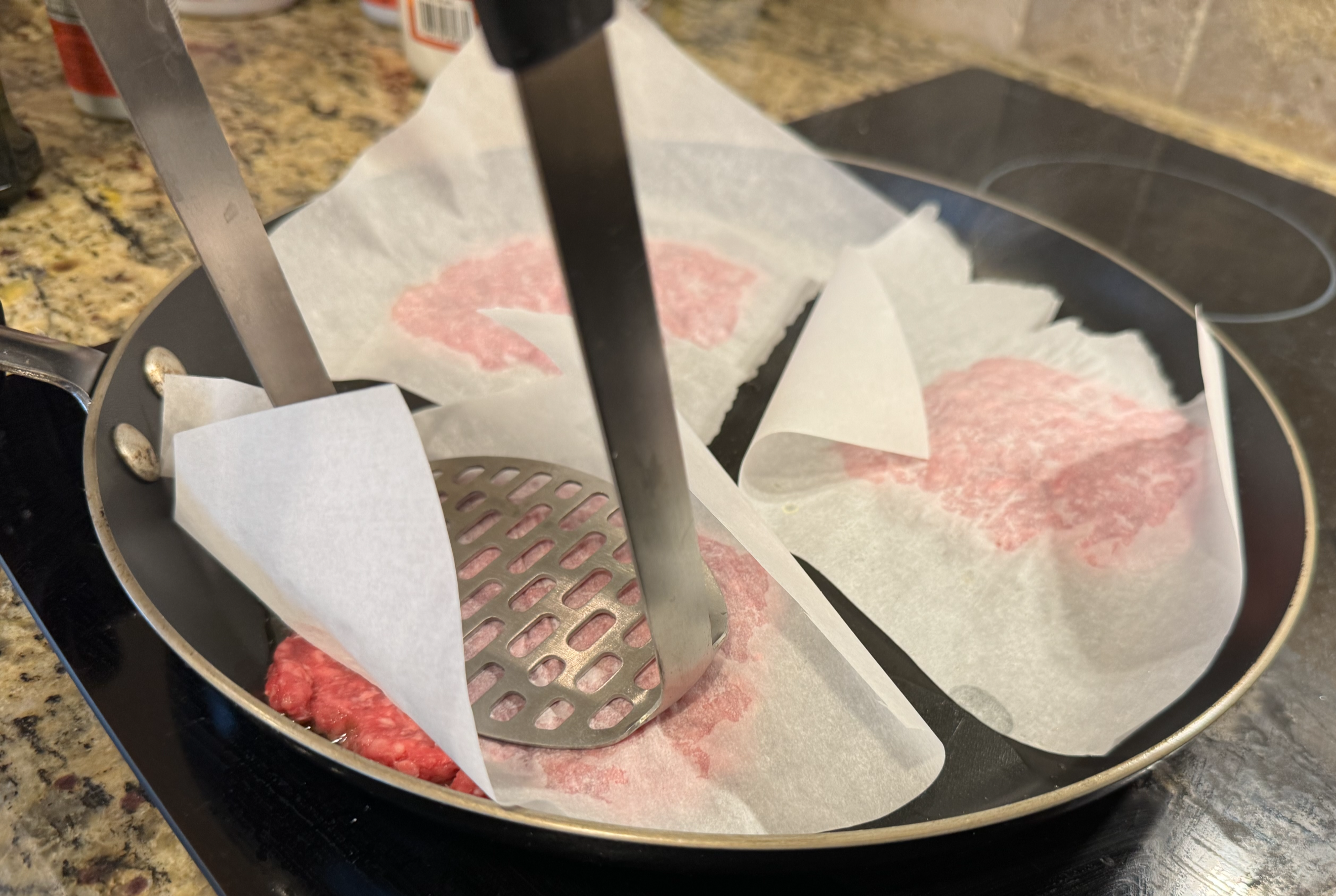 그리곤 뜨겁게 달군 프라이팬에 패티 세 개를 넣고 미리 잘라둔 기름종이를 위에 올리고 포테이토 매셔로 눌러줬다. 버거 눌러주는 게 따로 팔긴 하는데 집에 포테이토 매셔가 있는데다 기름종이 위에 눌러주는 거라 그냥 이걸로 하면 될 거 같아 따로 버거 누르는 걸 사지 않았다.